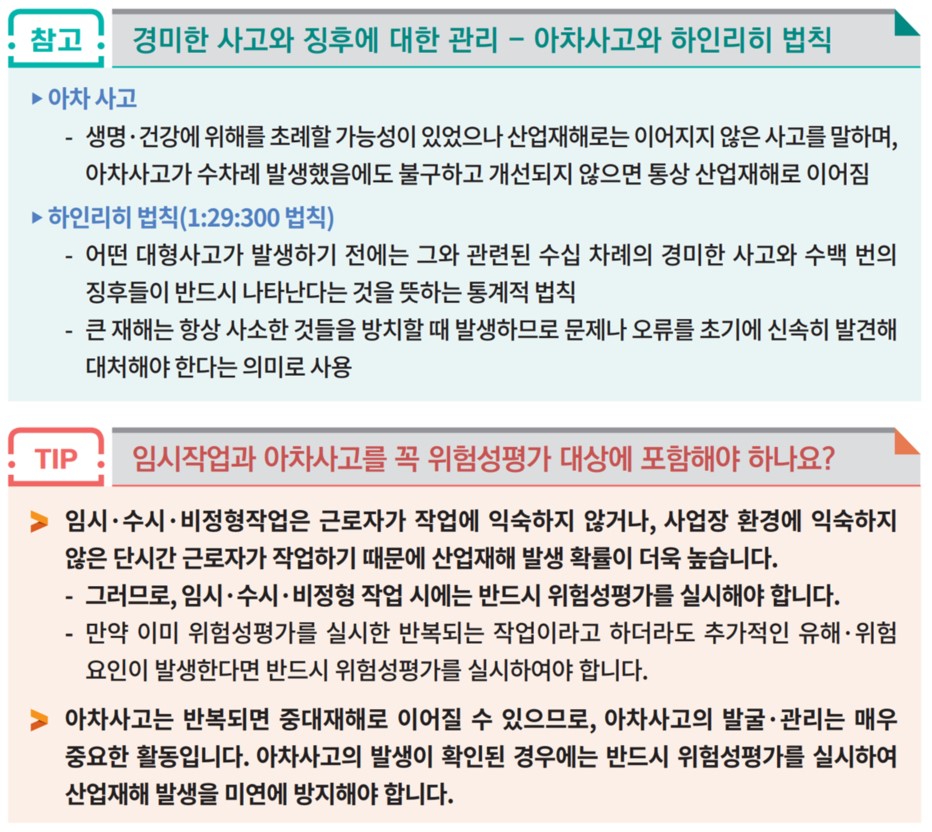 • 아차사고란 사업장 내에서 부상 또는 질병으로 이어질 가능성이 있었던 상황을 의미합니다. 결과적으로 사고가 발생하지는 않았지만, 향후 얼마든지 그 유해·위험요인으로부터 인적·물적 피해로 이어지는 사고가 발생할 수 있기 때문에, 꼭 위험성평가를 실시하는 것이 중요합니다.