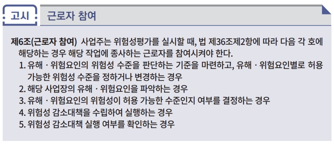 이번글에서는 험성평가의 실시할 때 근로자의 참여에 대해서 알아보도록 하겠습니다.