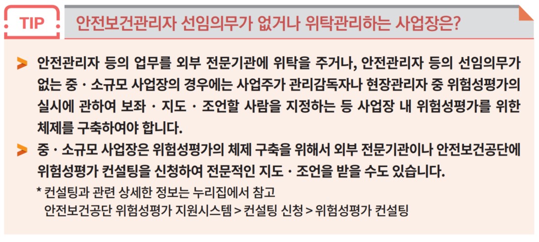 사업장이 스스로 위험성평가를 실시하기 어려운 경우에는 외부 전문가(기관)*의 컨설팅을 전체적으로 또는 부분적으로 받을 수 있습니다.