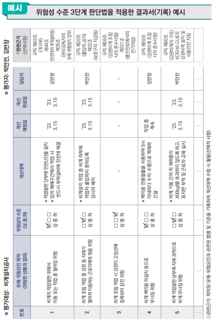 위험성 수준 3단계 판단법을 적용한 결과서(기록) 예시