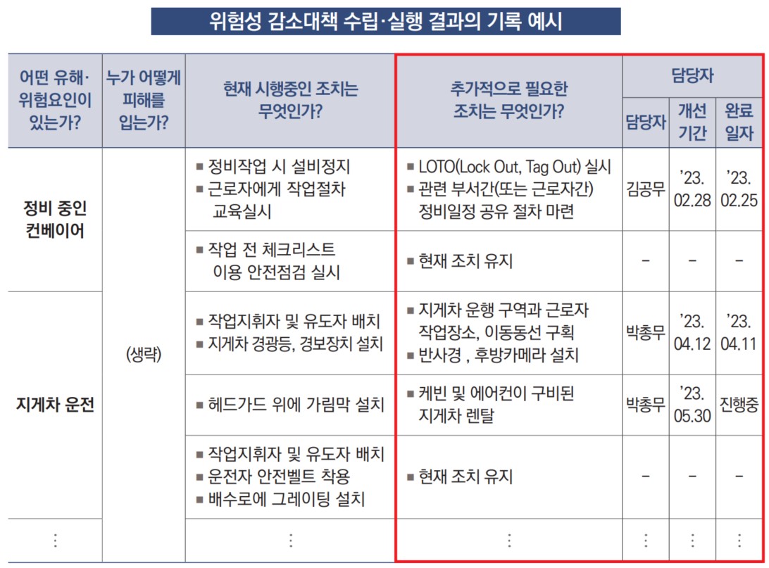기존 시행조치나 추가적인 개선대책이 근로자들의 부상 또는 질병으로 이어지는 위험성을 줄이는 데 얼마나 효과적인지는 아래 사항을 참고할 수 있습니다.