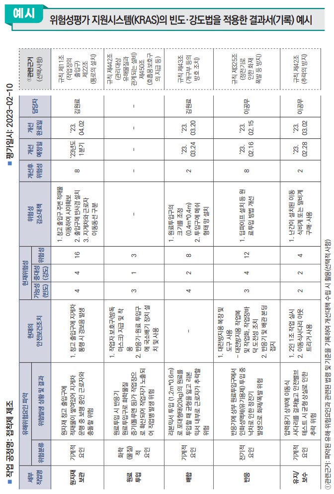 위험성평가 지원시스템(KRAS)의 빈도·강도법을 적용한  결과서(기록) 예시