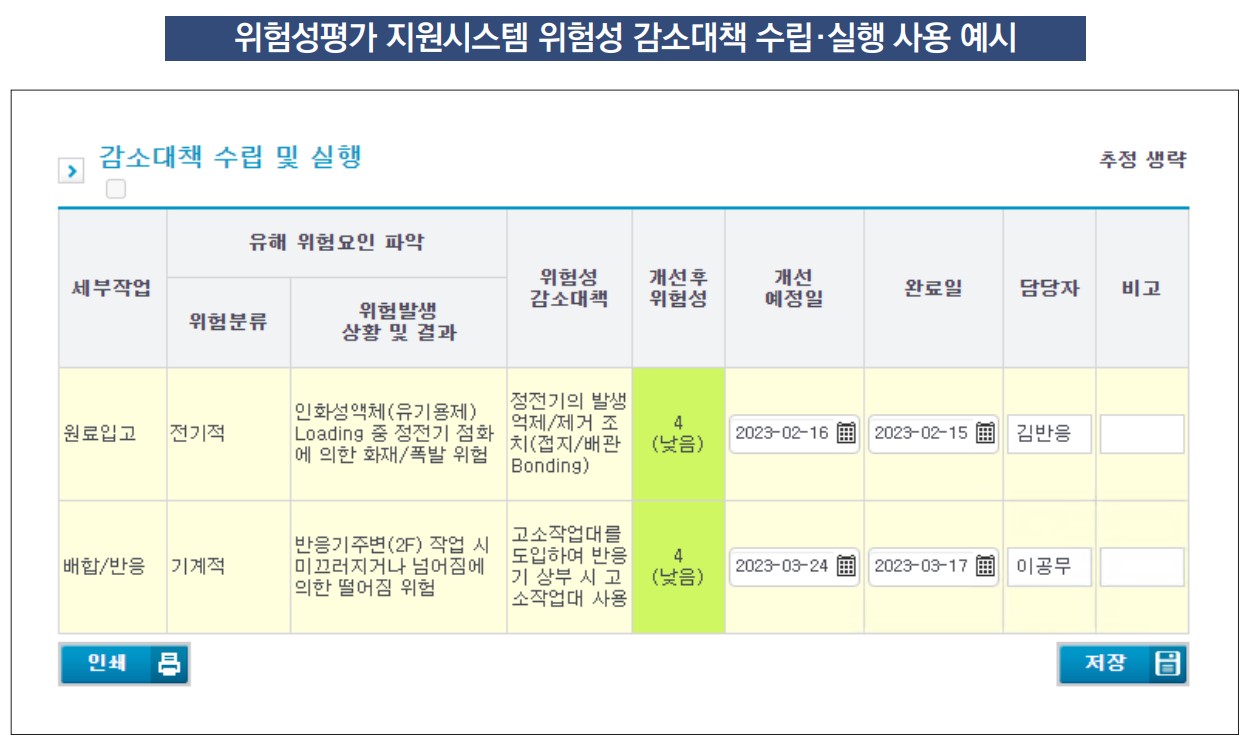 위험성평가 지원시스템 감소대책 수립실행 사용 예시 (출처 : 안전보건공단)