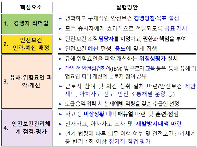 안전보건관리체계 구축·이행을 위해서는 (1) 경영자의 리더십, (2) 인력·예산 등 자원 배정, (3) 유해·위험요인의 파악·개선, (4) 안전보건관리체계를 점검·평가하는 등 핵심요소를 실행해 나가야 합니다.