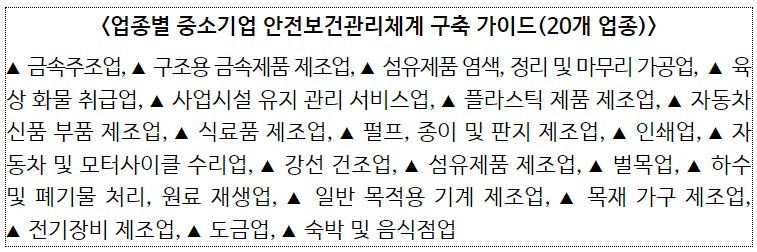 - 음식점・제과점 등과 같은 음식점업, 호텔 등 숙박업 등을 포함하여 주요 20개의 업종에 대한 ‘업종별 중소기업 안전보건관리체계 구축 가이드’ 및 ‘안전보건관리체계 자율점검표’를 마련·배포했습니다.