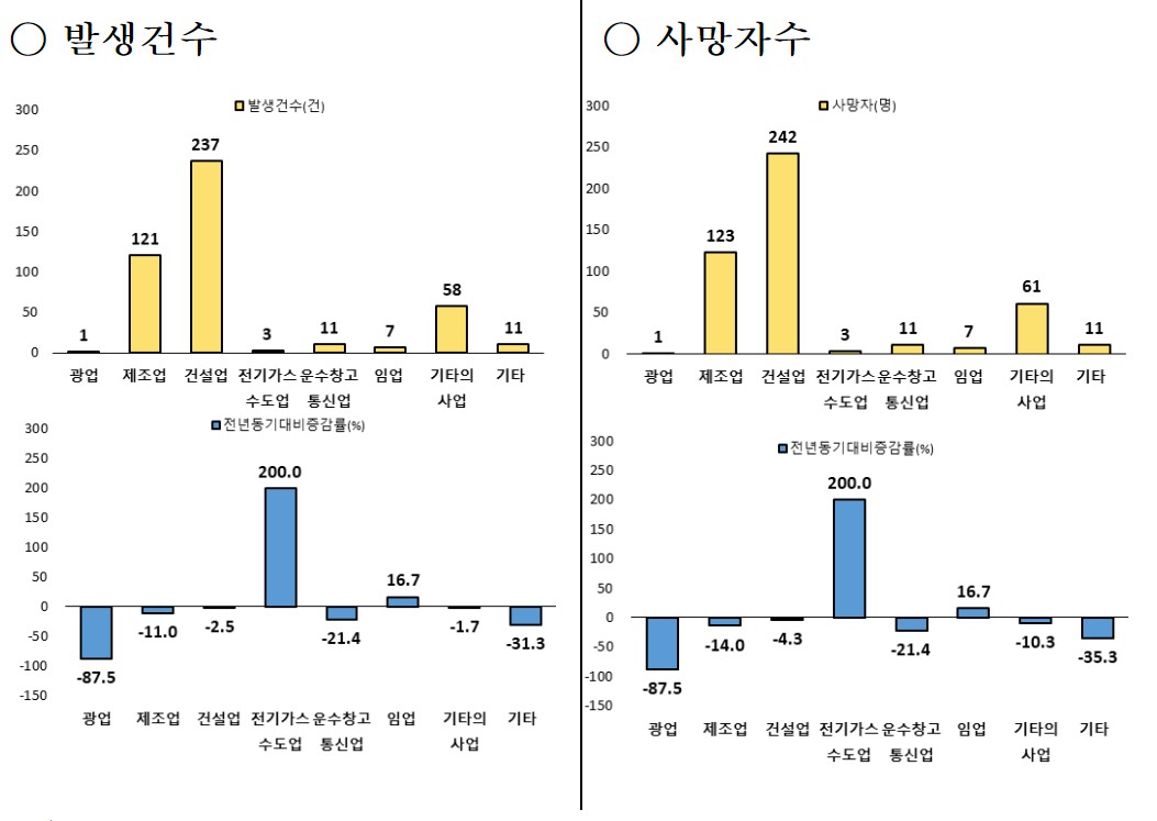 - 사망자는 건설업(52.7%), 제조업(26.8%), 기타의 사업(13.3%) 순으로 건설업에서 가장 많이 발생