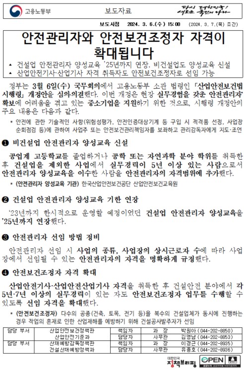 이번 개정은 현장 실무경험을 갖춘 안전관리자 확보에 어려움을 겪고 있는 중소기업을 지원하기 위한 것으로, 시행령 개정안의 주요 내용은 다음과 같습니다.