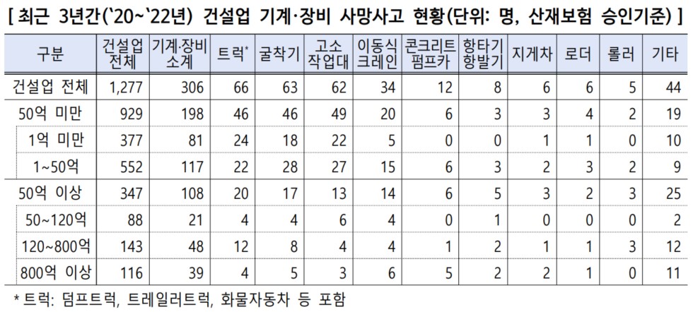 아래 표는 최근 3년간('20 ~ '22년) 건설업 기계·장비 사망사고 현황입니다.