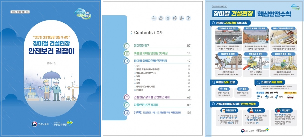 고용노동부는 2024년 장마철 건설현장 안전보건 길잡이를 배포하였습니다.