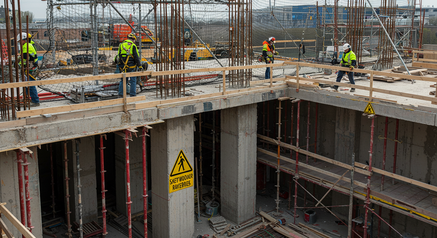 - 높이 2m 이상의 작업 발판, 개구부, 슬래브 단부 등 추락 위험이 있는 장소에는 반드시 견고한 안전 난간을 설치해야 합니다.