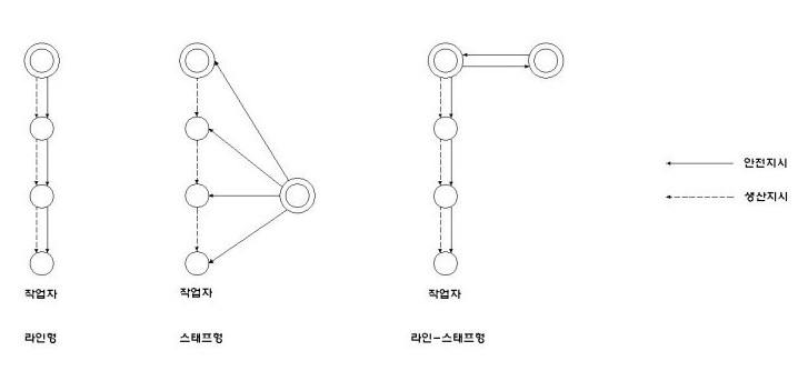 - Line형(직계식 조직) : 이 조직은 안전관리에 관한 계획에서 실시, 평가에 이르기까지 안전의 모든 것을 Line을 통해 관리합니다. 생산조직 전체에 안전관리기능이 부여되며, 안전을 전문으로 분담하는 조직은 없습니다. 근로자 수 100명 이하의 소규모 사업장에 적합합니다. 이 조직의 장점은 안전에 관한 명령이나 지시가 각 부분의 직계를 통해 생산업무와 함께 시행됨으로 안전에 대한 지시 및 전달이 신속하고 정확합니다. 그러나 단점으로는 안전에 대한 전문적인 지식 및 기술 축척이 어려울 수 있습니다.