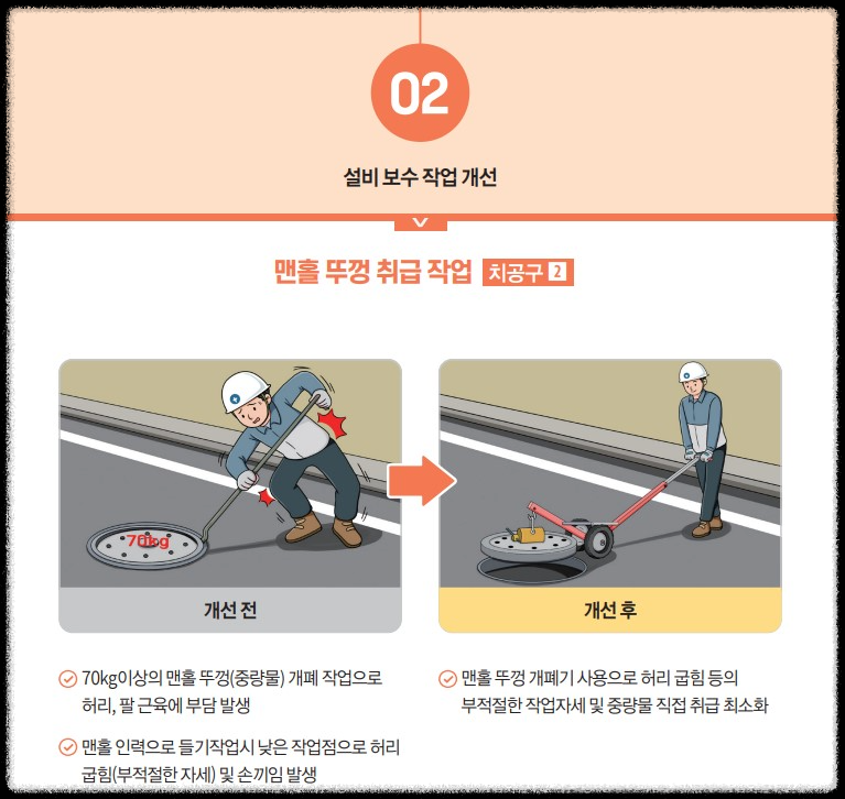 근골계질환 위험작업 개선사례집(2023년 6월)입니다. 안전보건공단에서 제작하였으며 제조업에 맞춰 제작되었지만 여러 분야에서 참고 가능하겠습니다.