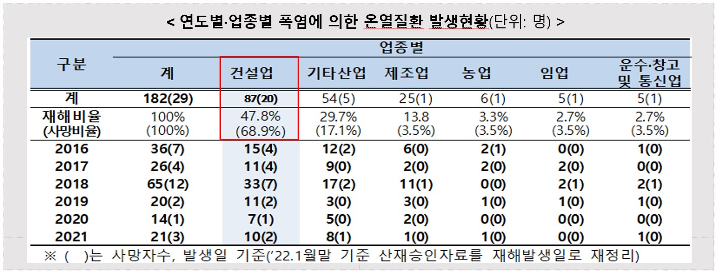 업종별로는 건설업(87명), 기타 업종(54명), 제조업(25명), 농업(6명), 임업(5명), 운수·창고 및 통신업(5명) 순으로 온열질환 환자가 발생하였고, 사망자의 약 69%(20명)는 건설업에서 발생하였습니다.