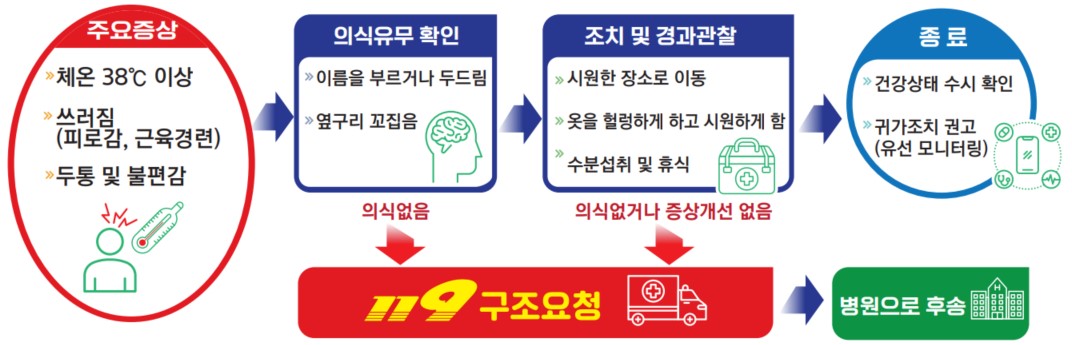 여름철 고온·다습한 환경에 장시간 노출되어 열사병, 열탈진 등 온열질환이 발생한 경우 아래 단계에 따라 신속히 조치하여야 합니다.