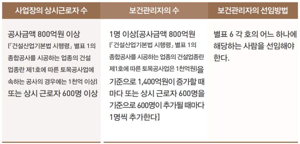 - 안전관리자 선임 : 공사금액 50억 원 이상, 보건관리자 선임 : 공사금액 800억 원 이상