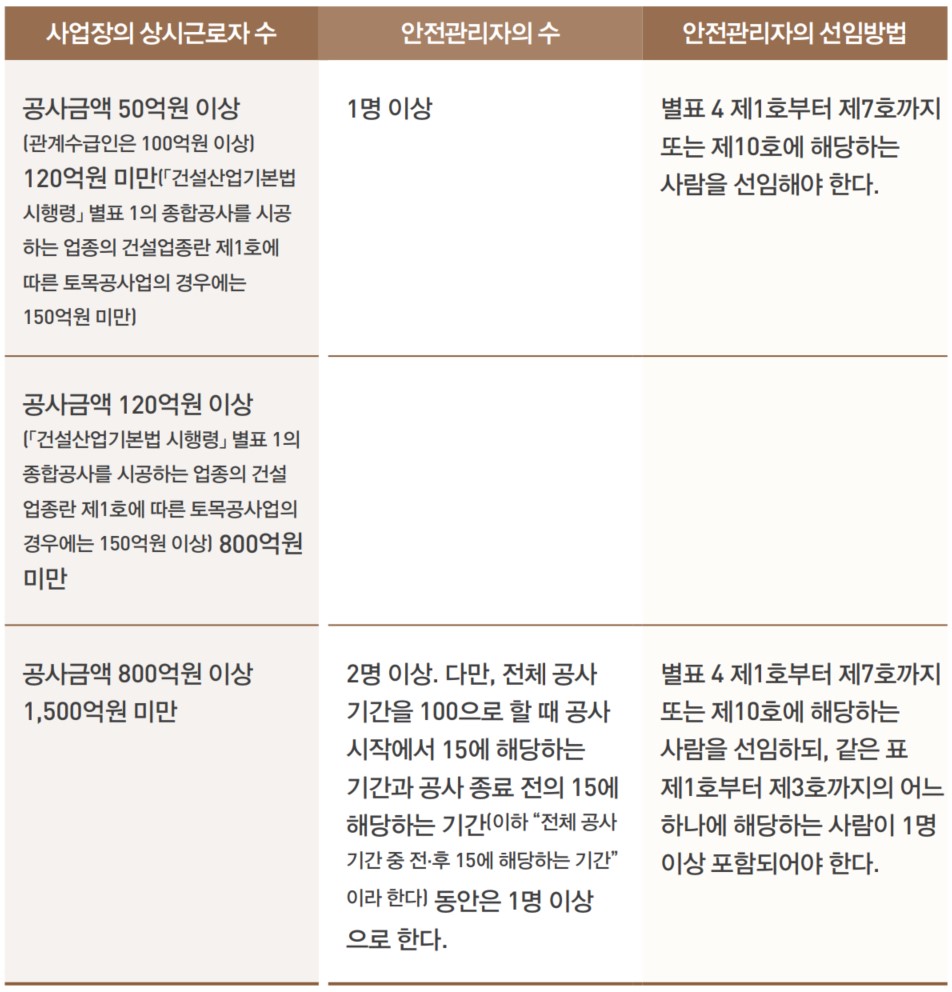 - 안전관리자 선임 : 공사금액 50억 원 이상, 보건관리자 선임 : 공사금액 800억 원 이상