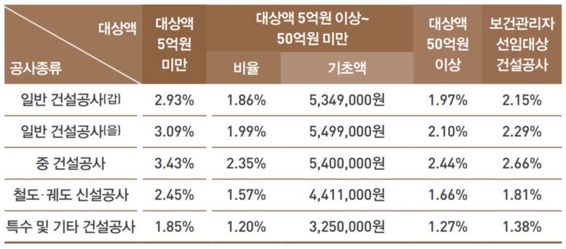 공사종류 및 규모별 안전관리비 계상기준표